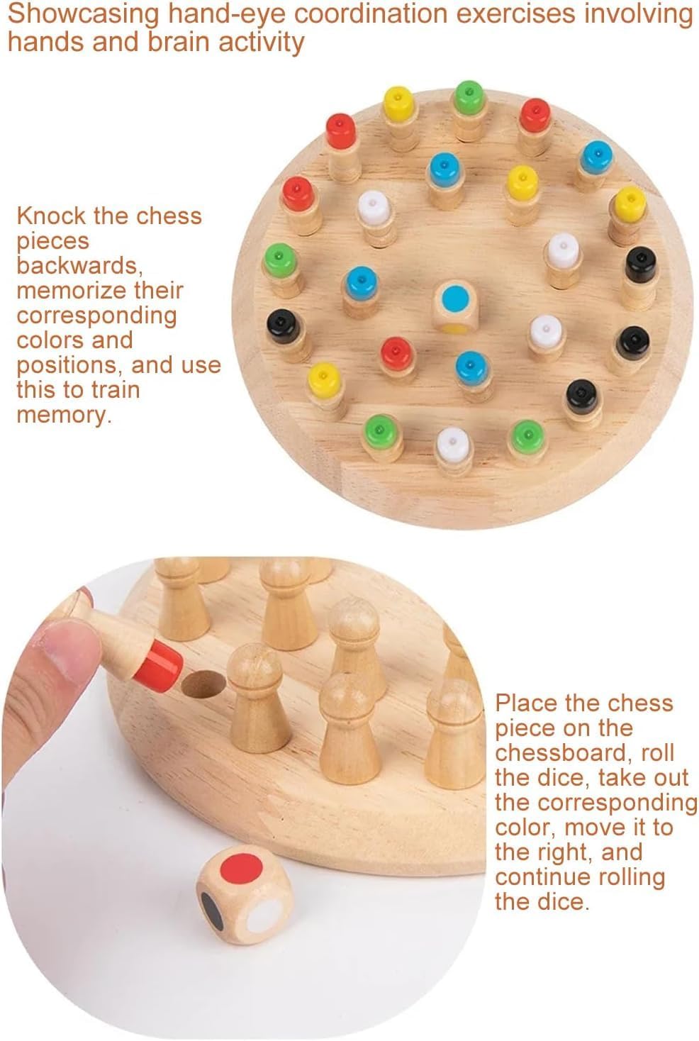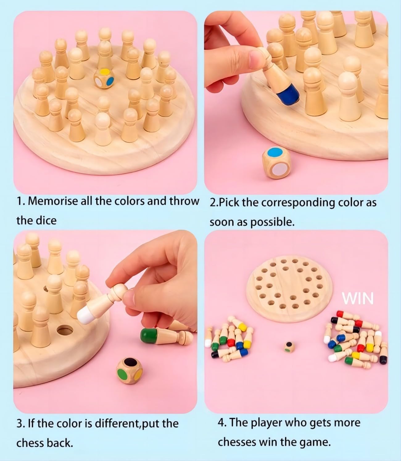 You’ll get a premium wooden game board, colorful memory pegs, a color dice, and a simple instruction guide.
