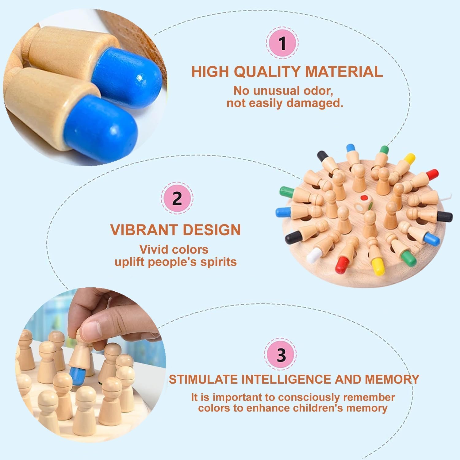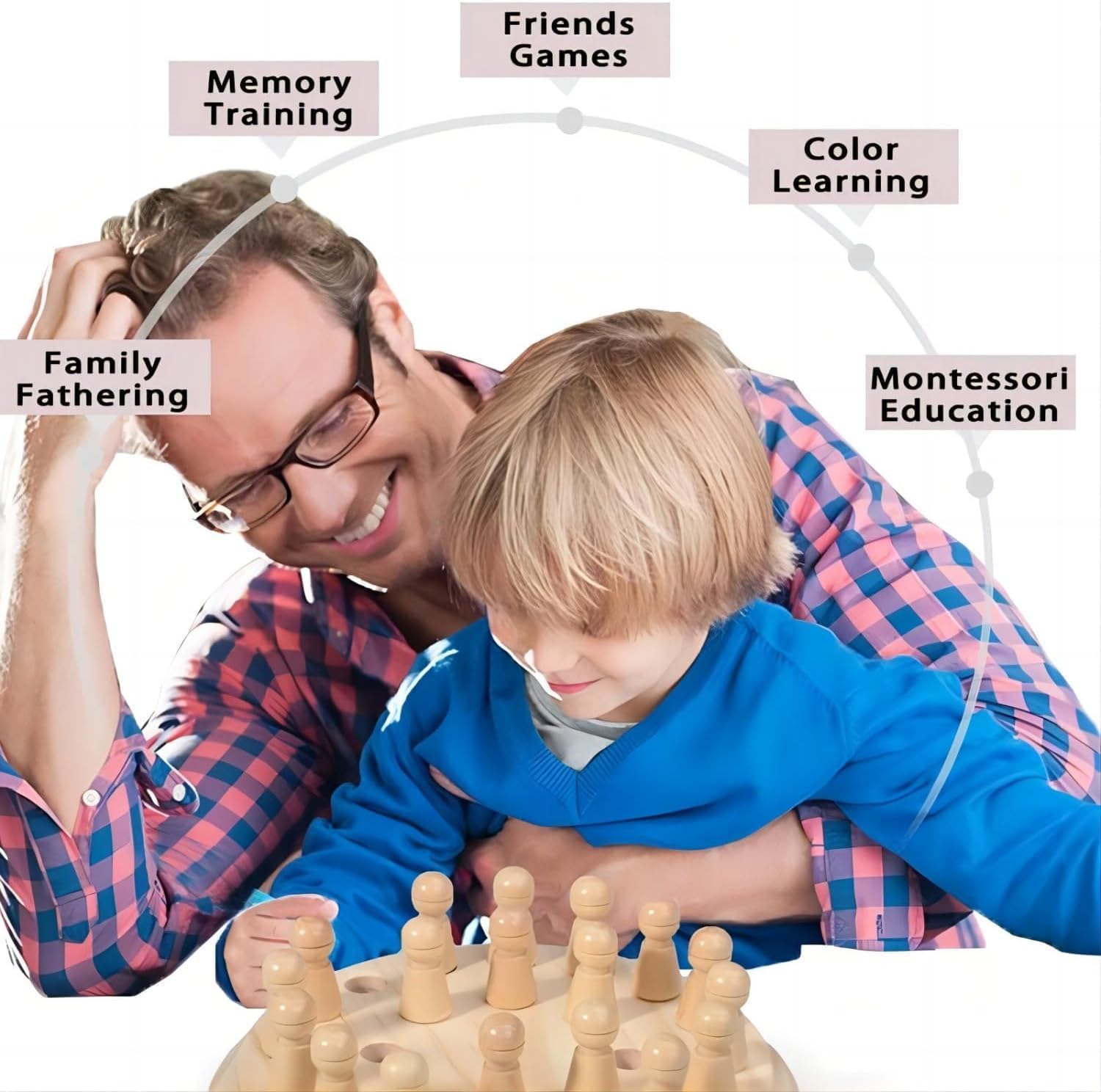 With MemoryMaster™, fun isn’t just fun—it’s purposeful. This beautifully crafted wooden memory game helps sharpen your child’s thinking, boost memory skills, and spark meaningful family interactions. Every turn is a chance to focus, recall, and bond. Designed to grow with your child, it blends brain-boosting play with laughter and connection—building joyful family memories while developing essential cognitive skills.